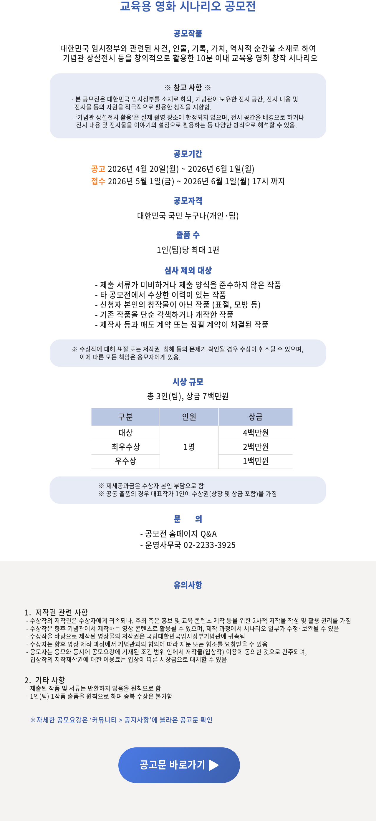 국립대한민국임시정부기념관 교육용 영화 시나리오 공모전 운영사무국 / 문의전화 : 02-2233-3925